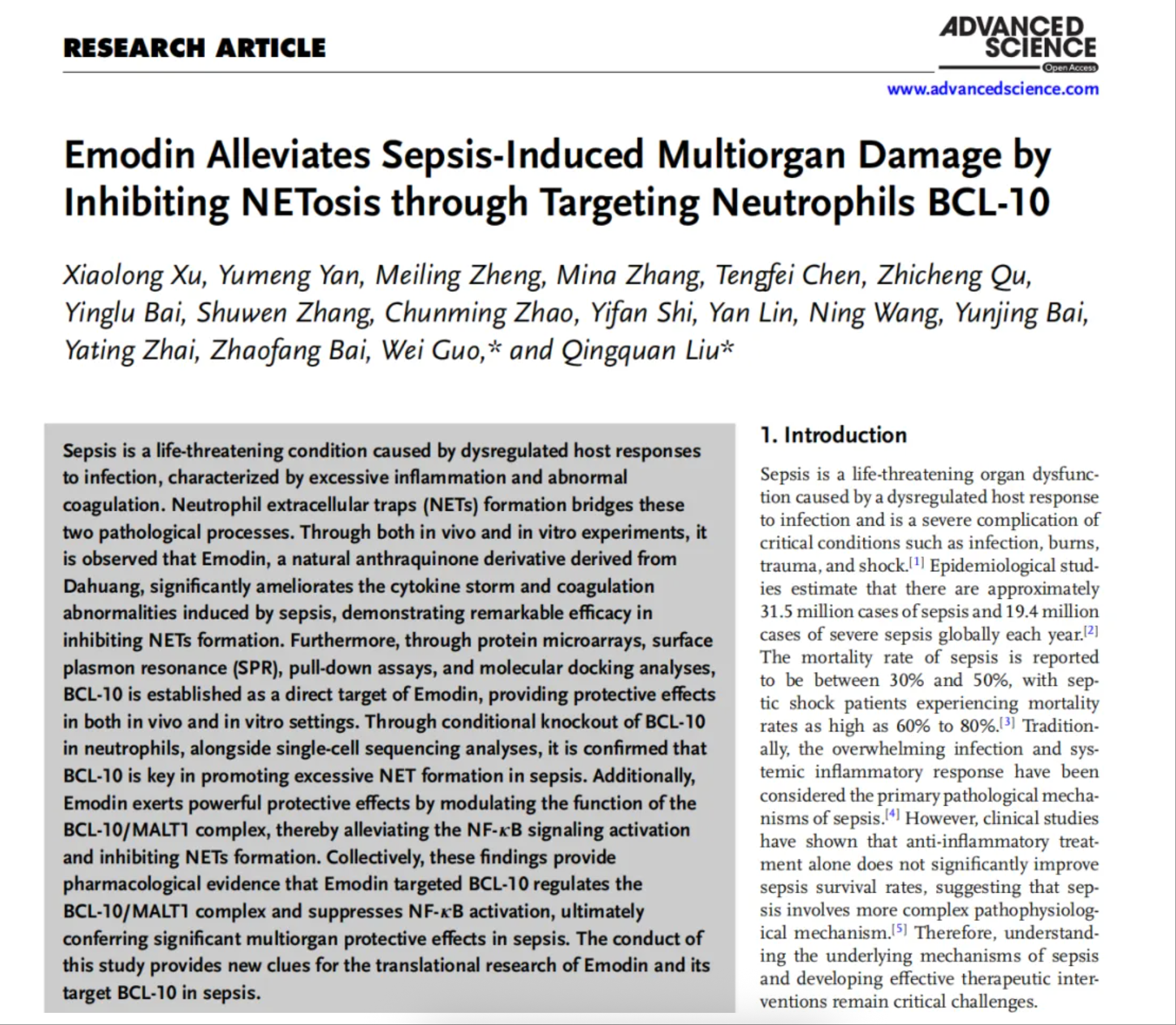 近日,首都医科大学附属北京中医医院刘清泉团队在《Advanced Science》杂志(IF:14.2,中科院1区Top)发表题为《Emodin Alleviates Sepsis-Induced Multiorgan Damage by Inhibiting NETosis through Targeting Neutrophils BCL-10》的基础研究文章,本研究系统阐述了大黄素(Emodin)——一种从中药大黄中提取的天然蒽醌衍生物,通过靶向作用于BCL-10,调控BCL-10/MALT1复合物,抑制NF-κB活化,显著缓解脓毒症诱导的细胞因子风暴和凝血异常,并在抑制NETs形成方面展现出显著功效。大黄素在脓毒症中赋予显著的多器官保护效应,本研究的开展为大黄素及其靶点BCL-10在脓毒症中的转化研究提供了新的线索。