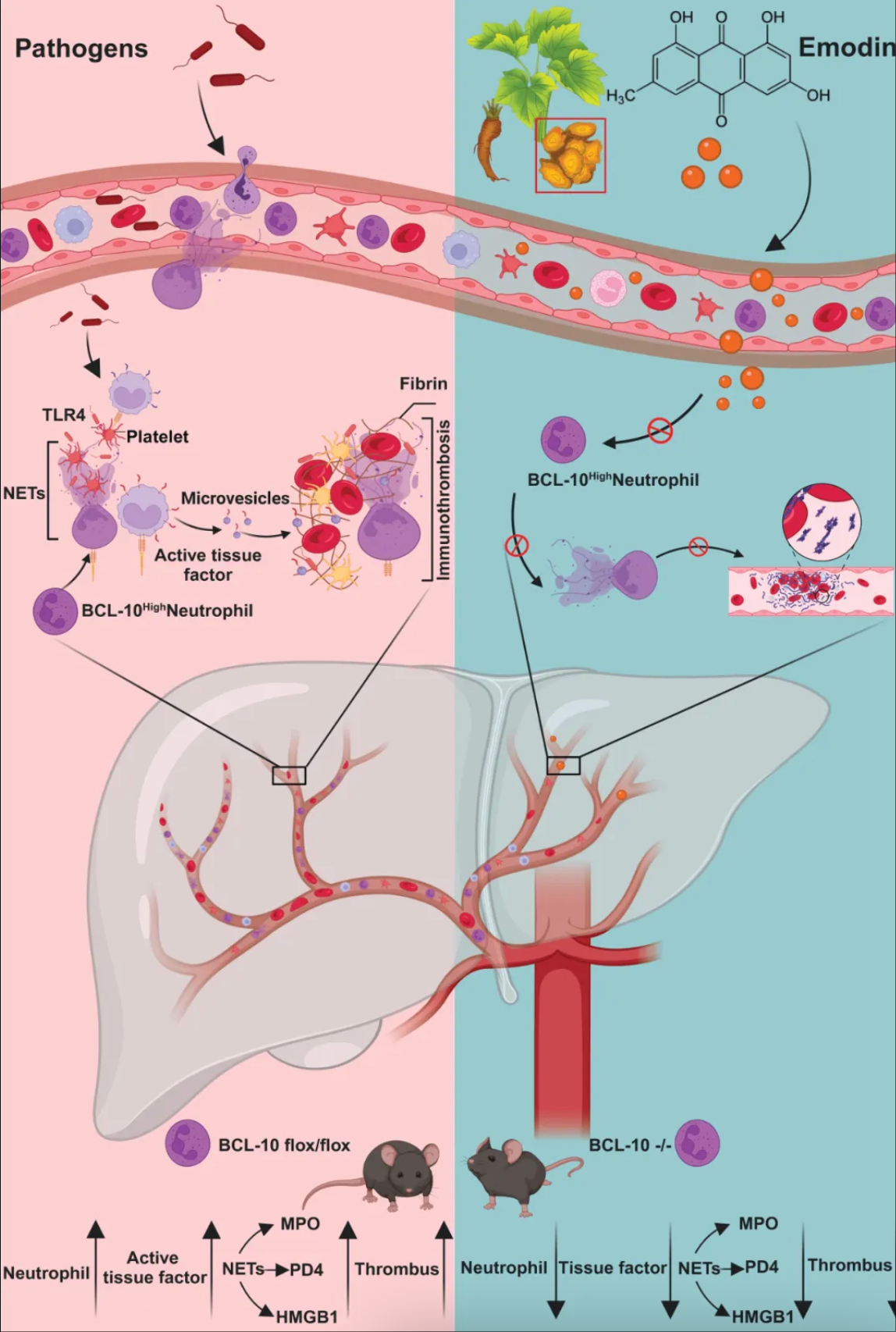 大黄素通过靶向BCL-10,调控BCL-10-MALT1复合体的功能,抑制NF-κB转录因子的活性,减少炎症-凝血异常激活、NETs的形成和脓毒症小鼠的死亡率,从而发挥多器官保护作用。