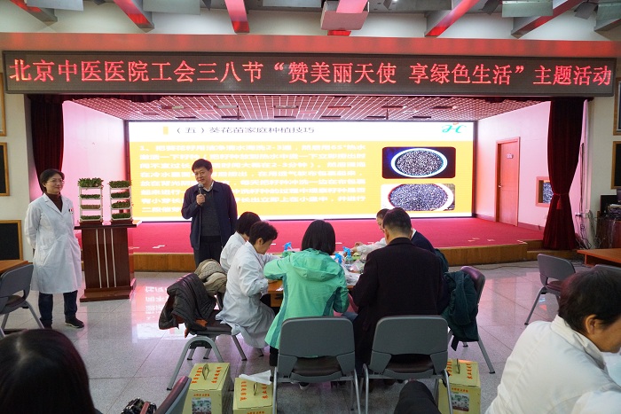 3月5日,院工会组织举办的庆祝三八节 “赞美丽天使 享绿色生活”主题活动正式启动。特邀北京绿山谷芽苗菜培训基地的张桂琴老师,带领职工们动手种植功能性芽苗菜。院长刘清泉、工会主席张金霞等院领导参与活动,并为职工们送上节日的祝福,鼓舞职工们一起来感受播种的快乐,分享收获的喜悦。