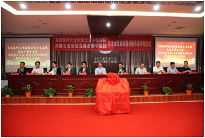 为落实《“十三五”期间京蒙卫生计生对口帮扶合作项目协议》和《北京市 内蒙古自治区三级中医蒙医医院对口帮扶贫困旗县蒙医中医医院工作实施方案的通知》要求,加强京蒙中医合作,提升内蒙古乌海市中医药服务水平,2017年 9月21日,首都医科大学附属北京中医医院刘东国副院长、王洪院长助理、医务处杜琨副处长及多个专业专家一行8人,前往内蒙古自治区乌海市,参加北京中医医院与内蒙古自治区乌海市蒙中医院、乌海市海勃湾区中医院技术协作启动仪式。内蒙古自治区乌海市委常委、市委秘书长全觉民、乌海市副市长康文胜、人大副主任任文义、政协副主席赵玉凤、乌海市卫计局局长信蕊、乌海市卫计委蒙中医药管理局局长段淳洁、乌海市海勃湾区政府副区长曹会仙、乌海市海勃湾区卫计委主任甄芮、两家技术协作医院的领导及部分干部职工代表出席了启动仪式。
