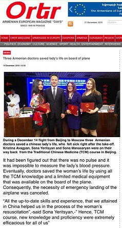 索娜介绍说,事情发生在12月14日,她们一行三人从北京国际机场乘坐飞往莫斯科的SU201航班。飞机起飞后大约一小时,机舱内突然传出空姐的声音:飞机上有一位女乘客,身体状况不太好,如果哪位乘客是医生,请提供紧急救助。她们三人立即起身,随空姐走到那位女乘客身边。“当时,那位女乘客情况非常危急,已经处于昏迷状态,脉搏微弱,血压也测量不到了。机组人员希望我们能确诊病人情况,如果病人情况恶化,飞机将在最近的机场迫降,以便抢救病人生命。”情况紧急,索娜等三人毫不犹豫地对病人使用了刚刚在北京中医医院学到的中医急救方法。经过一段时间抢救,那位女乘客渐渐苏醒,危险终于过去。确信生病女乘客危情已经缓解、身体状况趋于正常之后,索娜她们才平静下来。