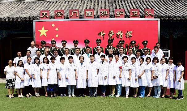 在国旗护卫队驻地,党委办公室主任许越之介绍了践行“两学一做”主题党日义诊咨询活动的意义,大家参观了国旗护卫队荣誉室,聆听了护卫队领导护卫国旗光荣历史的介绍,并与战士们合影留念。