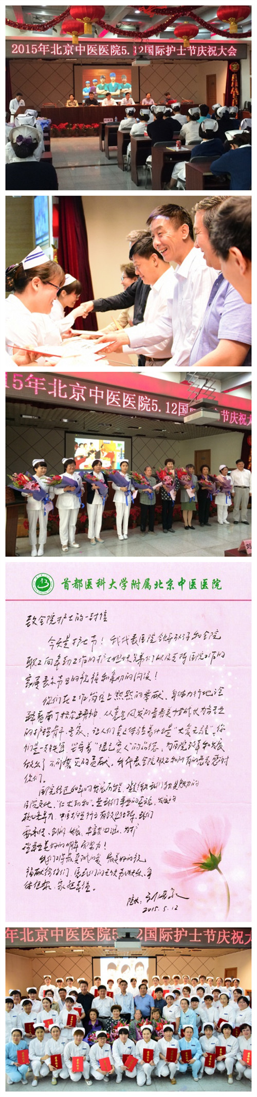 信彬书记首先致辞,他代表院党委及全院职工向辛勤工作在临床一线的白衣天使表示节日的祝贺,对过去一年中我院临床护理、教学、科研工作取得的成绩给予充分肯定。并鼓励全院护士要立足岗位,刻苦学习、努力提升自身的人文及业务素质,更好的服务于患者。刘清泉院长宣读了致全院护士及家属的亲笔信,对全院护士及支持医院工作的护士家属表示感谢和节日的祝福。信中说到,护理队伍是一支铁军,坚守着“律己宽人”的品德,为医院改革和发展做出了贡献,要求护理人员谨记“仁术勤和”院训,承传、发展、丰富中医护理内涵,为中医护理事业的明天而努力。四位护理部老主任、临床护士长及护士代表,代表全院护理人员接受刘清泉院长的致信及鲜花。