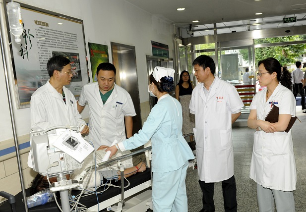 这次演练由医务处组织策划,设计了抢救开放性骨折、血气胸、创伤后血尿三个重伤员的模拟演练场景,分为四个考核小组分别对急诊护士的应急处理、三个伤员的紧急处置能力进行重点考核。应急预案启动后,急诊科护士根据伤情分检情况迅速通知各相关临床科室及辅助科室。同时,急诊科迅速上报门诊部及护理部。骨科、呼吸科、肾外科、普外科、肾病科、麻醉科、输血科、放射科、超声科、急诊西药房、器械调配中心等科室值班人员及非手术科室二线接到通知,第一时间到达急诊科。骨科赵峰大夫接到电话后2分30秒到达现场,反应迅速。输血科面对稀有血型、库存血不足的情况沉着应对,及时与血液中心取得联系。急诊西药房迅速从库房紧急调集“鱼精蛋白”。非手术科室二线协调器械调配中心在17分钟内调配到有创呼吸机一台。放射科CT室接到命令后立即开放绿色通道,保证伤员的紧急救治。门诊部及护理部主任迅速到达。