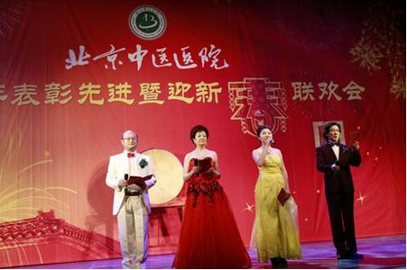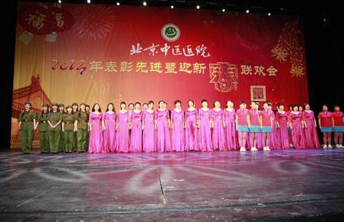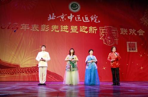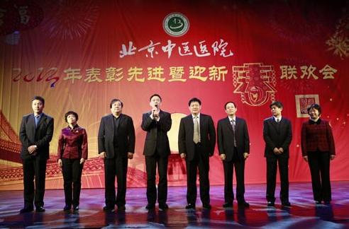 表彰先进会由党委副书记江宏才主持,院长刘清泉宣读表彰奖励通报,党委书记信彬致新春贺词。全体院领导为获奖先进集体、先进个人代表和获局级以上奖励的代表颁奖并集体给大家拜年。党委书记信彬和院长刘清泉衷心感谢全院职工2012年的辛勤工作。信书记在讲话中指出:2012年在上级领导正确领导下,医院深入开展“创先争优”活动,在援藏、援疆、援青海和京郊行等工作中,取得了显著的成效,获得卫生部等颁发的全国城乡医院对口支援工作先进集体称号。医院全年服务量与服务效益稳步提升,医疗业务收入有突破,职工工资收入有提高,学科建设硕果累累,并顺利通过国家中医药管理局组织的医院等级评审。医院荣获全国中医药应急工作先进集体称号;正式成为北京市中医住院医师(全科医生)规范化培训基地;获得国务院颁发的国家科技进步二等奖。2013年在院党委的坚强领导下,我院要以“突出中医药特色优势”为主线,以“优化科室结构、改进服务流程、提升综合实力”为目标,坚定信心、团结协作、攻坚克难,共同创造北京中医医院美好的明天!