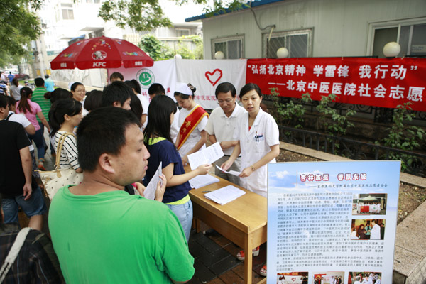 上午是医院门诊的高峰期,患者在就医时,常常会遇到这样那样的问题,虽说各个楼层都设有服务台,可应对七八千的门诊量,还觉得不够用。为了帮助患者答疑解惑,方便患者就医,北京中医医院实施“首问负责制”,医院要求每一位“穿白大褂”的中医人,不管哪位患者在医院里问到你,都有“导医”的责任,一定要负责解释到位,让患者满意。除此之外,还启动了“青年志愿者导医”活动。从早晨7点半开始,青年志愿者上岗导医。这些志愿者来自各个科室,有医生,有护士,也有药师。为了不影响本职工作,他们利用倒休或下夜班的业余时间为患者导医服务。青年志愿者导医上岗前都经过了严格培训,包括熟悉科室楼层分布、各科治疗范围、就诊流程等等,以保证导医的服务质量。