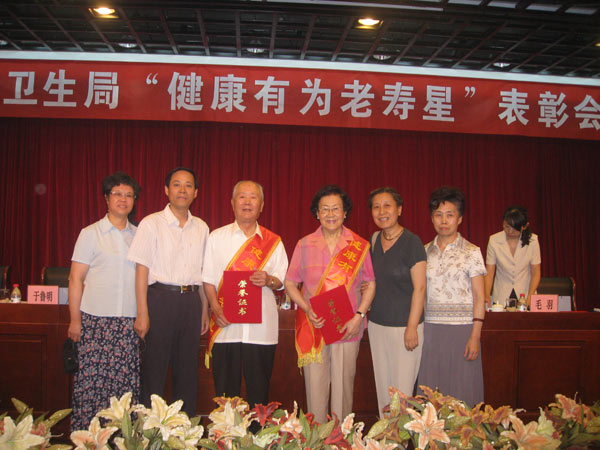 6月20日北京市卫生局召开健康有为老寿星表彰大会。会上表彰了60位健康有为老寿星,我院90高寿的全国著名中医皮肤科专家陈彤云、87岁的全国著名中医外科肛肠病专家王嘉麟获此殊荣。会上,党委副书记江宏才代表院党委汇报了近年来我院离退休工作情况,并表示今后我院要把离退休工作做得更好,让我院的老同志晚年幸福,老有所乐、老有所为。健康有为的老寿星越来越多!