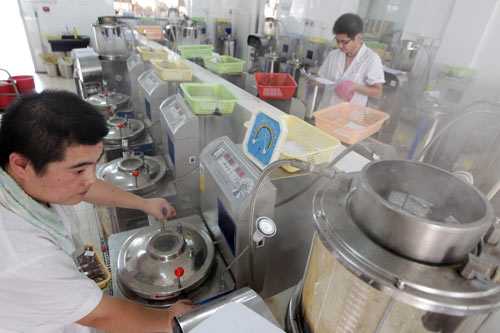 下午3时到5时是这里最热最闷的时候。记者在屋子里站了一小会儿已经浑身是汗,来回巡视的煎药师们还必须穿着白大褂,后背早就湿透了。“一个班下来,我得换4身衣服,都能拧出水来。矿泉水能喝八九瓶。”一位年轻的煎药师挺幽默,“朋友都说我们皮肤肯定好,天天蒸中药桑拿嘛。”