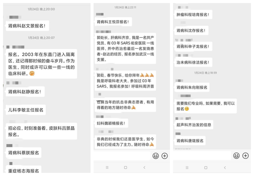 1月下旬,北京市组织第一批医疗队紧急奔赴一线,“若有战,召必回,战必胜”,肾病科主任赵文景带头报名,王悦芬、郑桂敏、蔡朕、赵静等十余名医师第一时间积极响应国家和医院号召,报名逆行战疫。科室全体护士均踊跃报名参战,护士长李倩,护士赵妍、苗默含已被选派为备战队员。