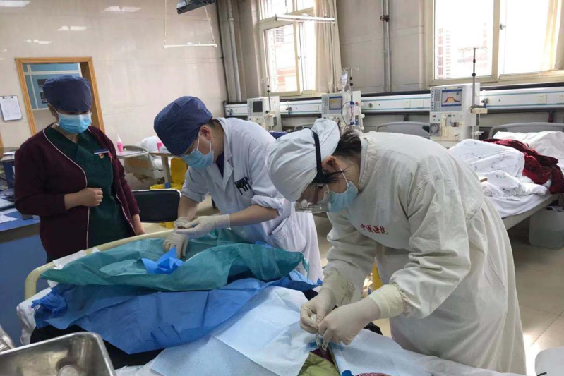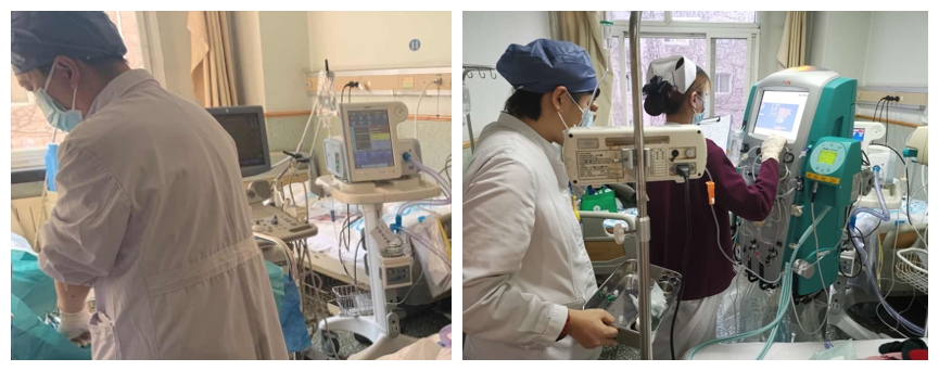 蔡朕副主任医师,赵妍、苗默含护士为重病人行血滤治疗。