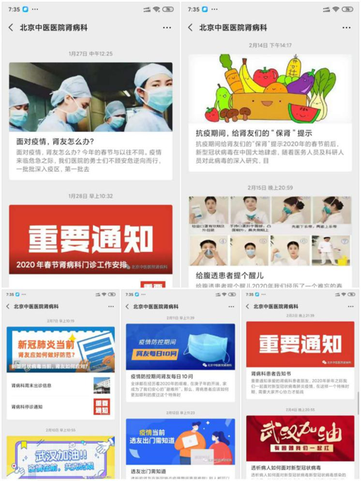 通过公众号等网络平台,为广大患者及时推送门诊预约、停诊情况及疫情期间注意事项。从战“疫”打响至今,肾病科公众号已发表疫情相关科普文章10篇,门诊出诊信息及重要通知11篇。