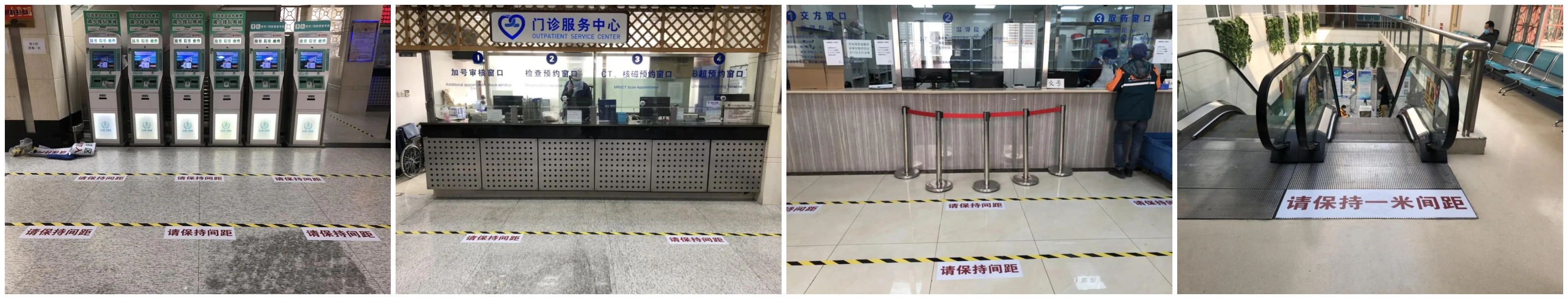 为降低患者交叉感染的风险,医院设置了一米线标识,提示患者保持相对安全的距离。尤其是在取号机、取药窗口、门诊代煎室等人员集中的地点,均设置多条一米线,提示患者排队时保持间距。同时在扶梯、预检分诊处也设置请保持间距的提示标识,提示患者在院内走动期间与他人保持一定的安全距离,以此降低感染风险。