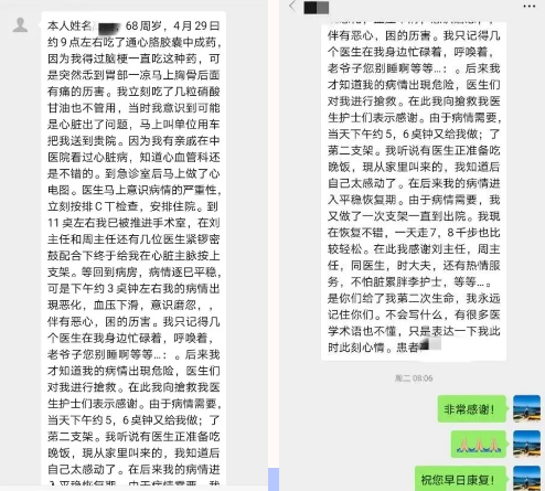 近日,我院心血管科胸痛中心团队收到患者高大爷的感谢,他在微信中写道:我恢复的不错,一天走七八千步也比较轻松,谢谢你们给了我第二次生命!