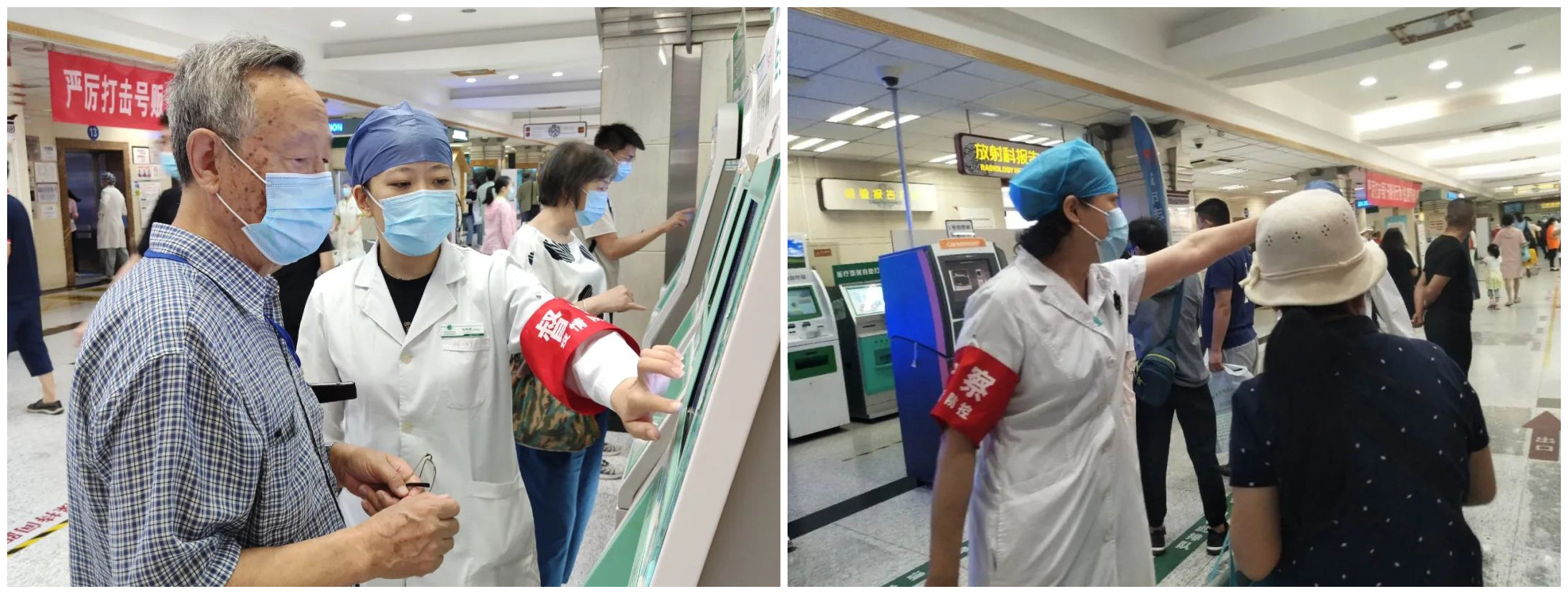 防控疫情,人人有责。门诊各楼层均实现以科室为单位的区域自治管理,医务人员在完成患者诊治的同时,及时转换角色,投入到疫情防控督导工作中来。医院门诊楼里,忙碌行走的“红袖标”随处可见,这不仅仅是身份的代表,更是一份沉甸甸的责任。