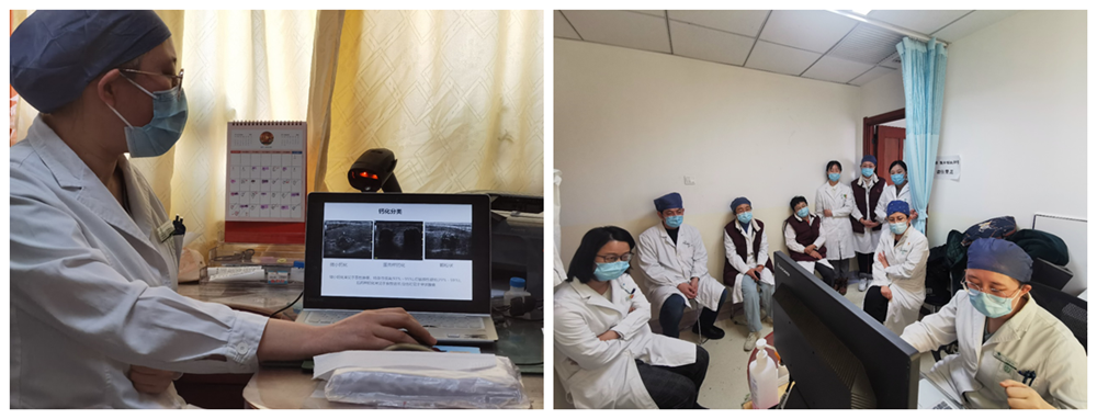 超声诊断科包晶晶医师针对甲状腺疾病的超声影像特点、甲状腺超声造影和超声引导下细针穿刺细胞学(FNAC)两项检查技术进行了详细的讲解。超声诊断科刘雪梅主任介绍了目前甲状腺超声造影和超声引导下细针穿刺细胞学(FNAC)的临床应用情况;内分泌科尚菊菊主任针对两项检查技术的风险评估和应急预案的制定进行了进一步探讨;参会医师针对检查项目开展流程、注意事项等内容展开了充分的交流和讨论。