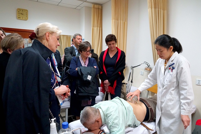 上午9点欧美医师团到达医院,首先前往重症监护病房(ICU)、针灸科、中药调剂室进行参观。ICU主任与一线医师介绍了科室情况及中医在治疗急重症方面的特色诊疗方法;针灸科则安排了经验丰富的临床医师现场演示了针刺与拔火罐治疗腰腿痛;在中药调剂室,科研处及药学相关人员介绍了中草药的种类、煎煮方法等。随后在门诊六层阶梯教室与医院8个重点学科的青年骨干进行了学术交流,肿瘤、针灸、消化、心血管、皮科、急诊的科室骨干精心准备了介绍幻灯,并全英文介绍了学科的研究方向、特色技术与方药、国际交流合作等情况。外国医师们就感兴趣的话题进行了提问,现场互动效果良好。医师团当中还有一位身份“特殊”的大夫,她就是斯洛伐克共和国驻华大使夫人贝妮亚,夫人认真聆听了介绍并表示通过今天的访问收获很多,特别对中医针灸和传统保健很感兴趣,希望今后有机会再来北京中医医院。活动最后双方合影留念,互留联系方式,为今后交流与合作打下基础。(科研处)