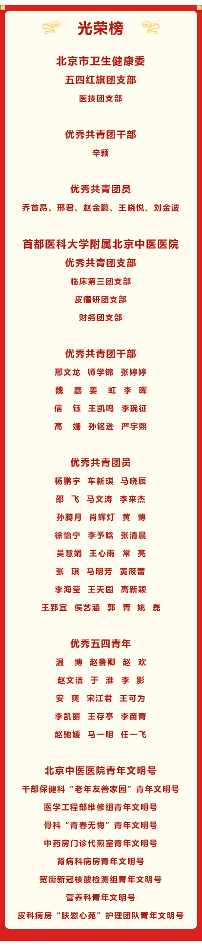 2021年5月10日,北京中医医院团委召开“建党百年正青春,跟党奋进新时代”五四表彰大会。党委书记董杰昌、院长刘清泉、党委专职副书记温淑兰、党委副书记程军、副院长徐春军、刘东国、工会主席张金霞、北京中医研究所副所长李萍及各党支部书记、科处室主任、团员青年代表等180余人出席。会议由团委书记张晨曦主持。