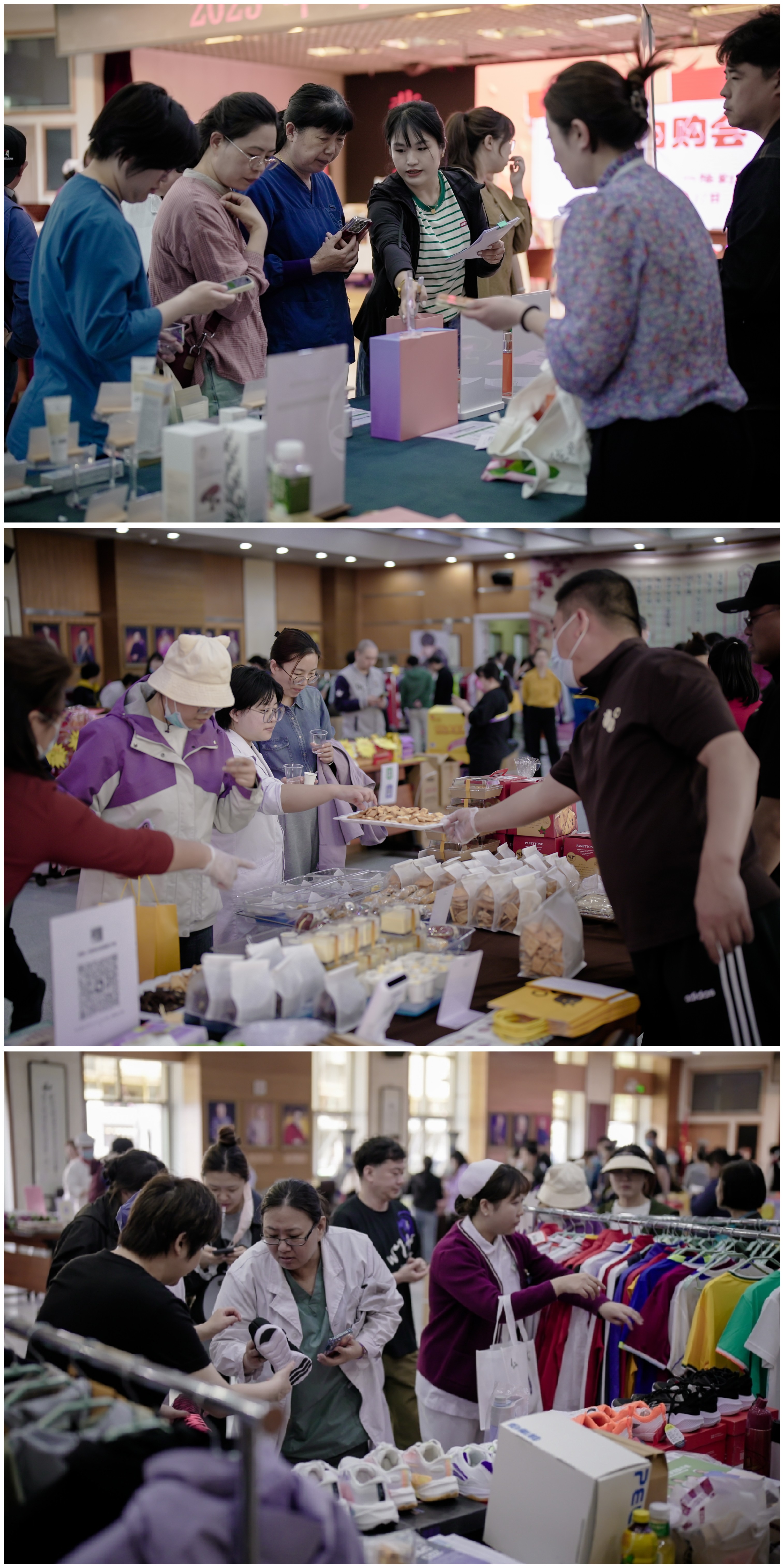 “美”主要由北京首都中医医疗科技开发有限公司、北京杏林药业有限公司以及北京市中医药研究所提供:“陈彤云”系列化妆品、代茶饮、杏林懿面膜粉、杏林糕点、侧柏叶洗护套装等产品,深受职工欢迎。 “衣”由伯希和、李宁、建侬、艾图爱四家品牌提供产品,是我院历届运动会的服装供货商,产品品质好,折扣力度大。“食”包括医院职工食堂、廿一客蛋糕、小蜜蜂蛋糕、米面粮油、干果蜜饯、海鲜类、肉蛋类等产品,同时提供配送到家服务,大量产品提供品鉴、试吃,利用休息时间,职工们边吃边逛边买。“用”包括家居家纺类产品、国家乒乓球队联名定制产品、携程旅游服务等,种类丰富。