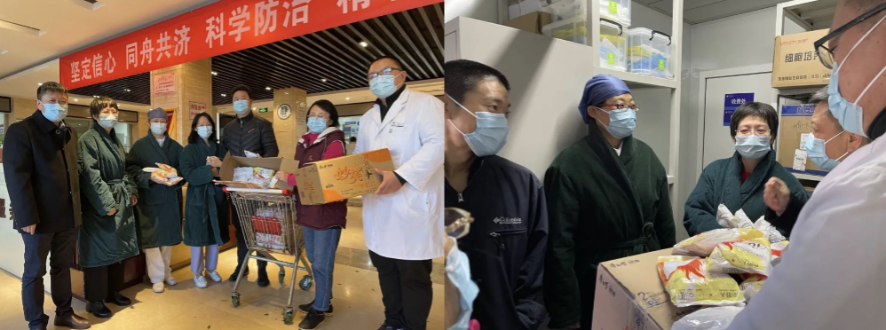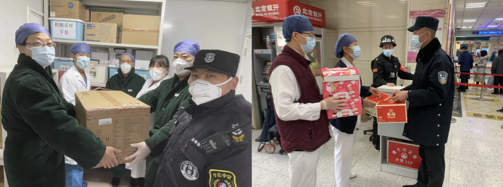 抗疫,我们始终在一起。护士长将防寒物资分发给保安、护工等工作人员。