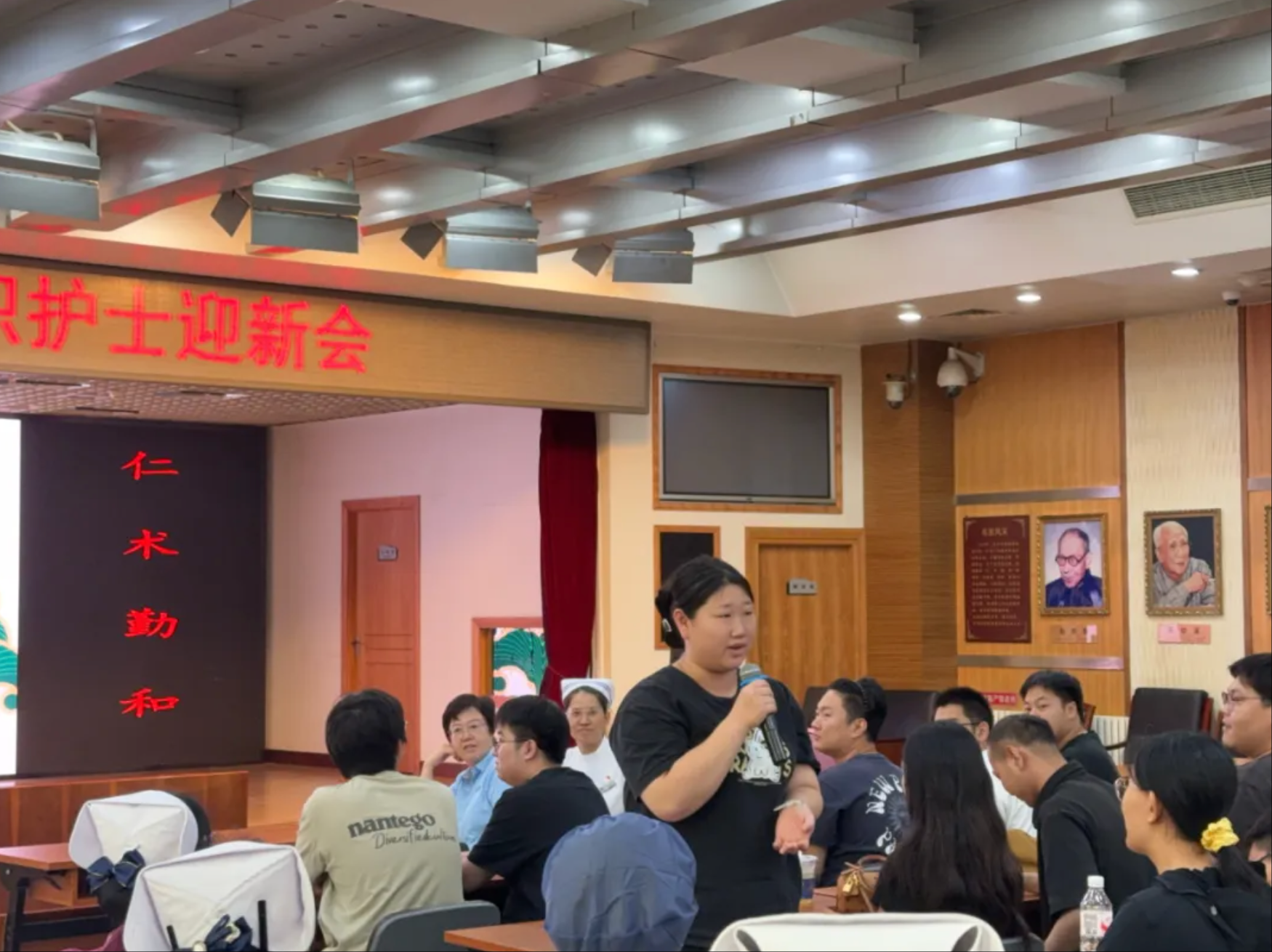 裴晓璐在迎新会上致辞并代表护理部全体同仁欢迎新成员的加入。她指出,护理工作是充满爱与责任的神圣事业,鼓励新护士以敬畏之心对待职业,以专业之力守护生命。