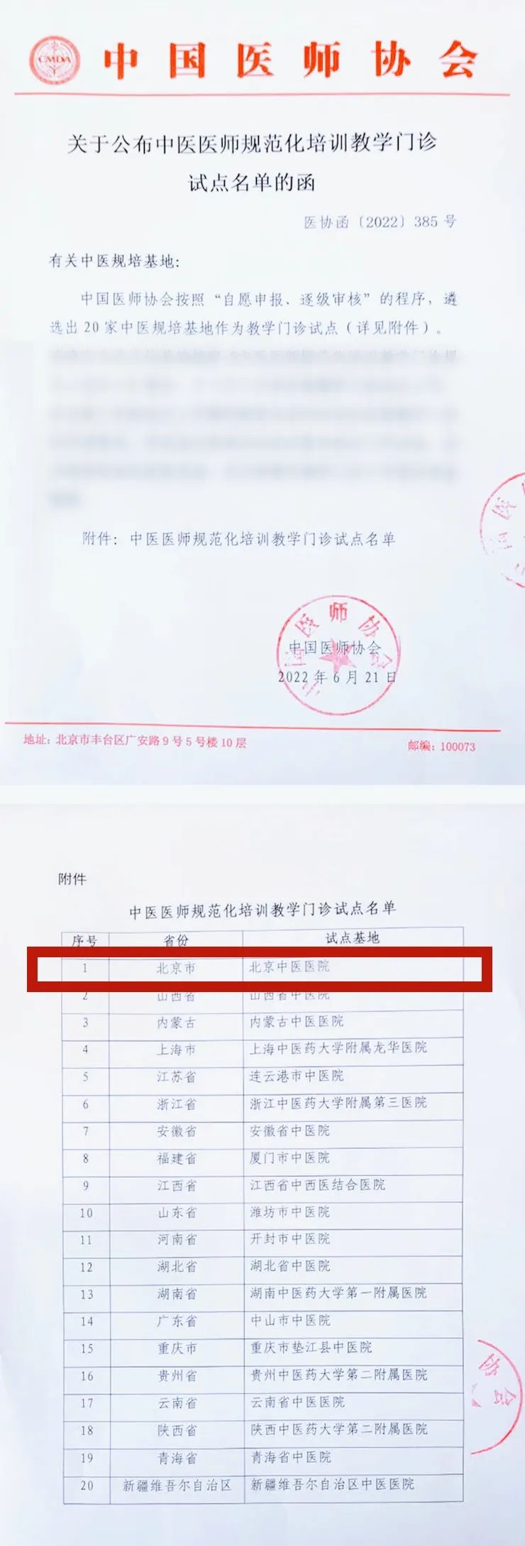 近日,我院被中国医师协会遴选为中医医师规范化培训教学门诊试点基地。经遴选评议,全国有20家基地入选,我院从268家中医住培基地中脱颖而出,成为北京市唯一入选单位。