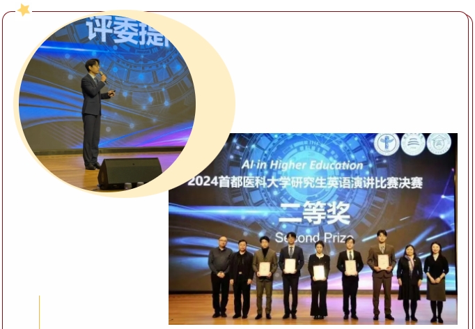 在首都医科大学举办的以“AI in Higher Education”(高等教育与人工智能)为主题的研究生英语演讲比赛中,2024级针灸推拿专业硕士研究生穆泓宇凭借其出色的演讲技巧和对主题的深刻理解,荣获二等奖。他的演讲内容逻辑清晰、条理分明,充分展现了他对人工智能在医学教育中的应用潜力的思考。