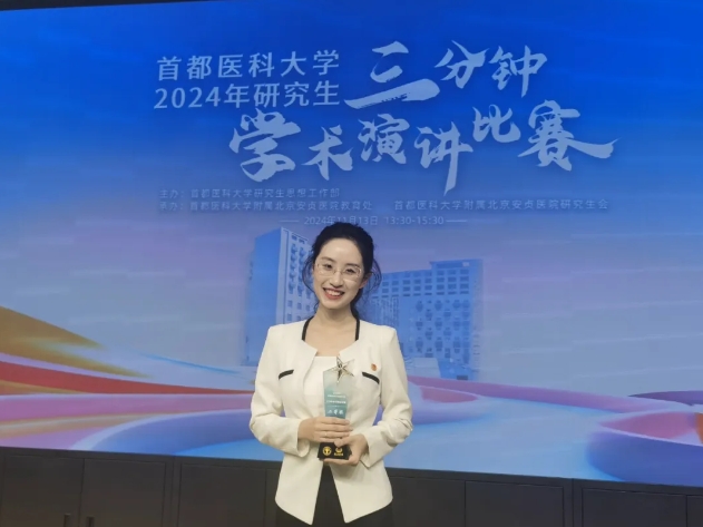 卢欣宇凭借其出色的学术素养和演讲能力,荣获首都医科大学2024年研究生三分钟学术演讲比赛二等奖。她在比赛中展现了扎实的学术功底和卓越的表达能力,充分展示了北京中医医院优秀研究生的风采。