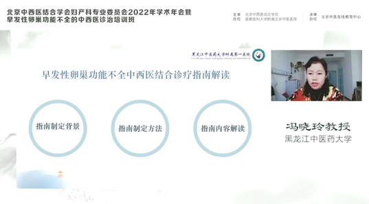 学术会议中,黑龙江中医药大学附属第一医院冯晓玲教授首先对《早发性卵巢功能不全中西医结合诊疗指南》进行解读。她从该指南所提到的POI的定义、流行病学特征、病因、诊断方法、治疗等多方面,梳理了中西医对POI的认识和防治策略。
