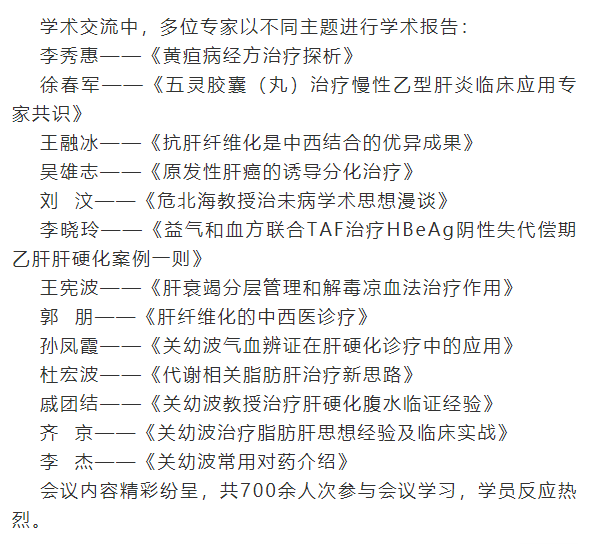 北京中医药学会肝病专业委员会主任委员、北京中医医院肝病科主任孙凤霞教授主持会议,邀请了徐春军、李秀惠、王融冰、吴雄志、王宪波、郭朋、杜宏波、戚团结、齐京等多位知名中医肝病专家及关幼波先生学术传承人分享关老临床学术经验及常见肝病的中医诊疗思路。