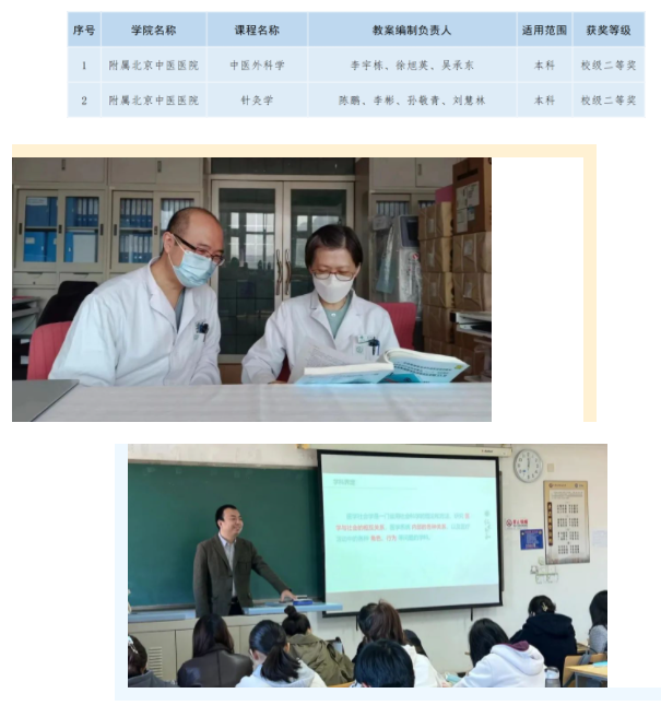 近日,北京市教育委员会组织开展2022年北京高校“优质本科教案”评选,经教师个人申请、学院推荐、学校评审,我院中医外科学教研室、针灸教研室2门课程获评首都医科大学校级二等奖。