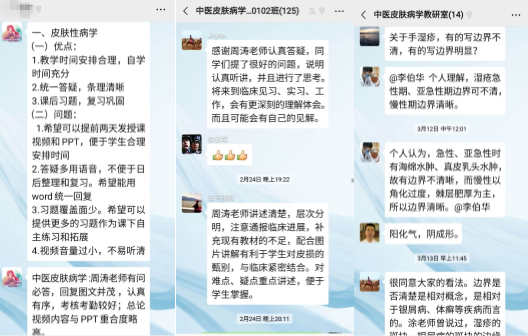 目前课程已经过半,每次课程中同学们都踊跃提问,提问数量远超常规课堂,更有一些高质量的提问反应出了同学们正在逐步形成中医思维模式。这说明同学们在家中视频学习过程中有了更充裕的时间思考,而老师们也在这一个个问题中,发现授课中的不足。同学们高涨的学习热情,也让老师们倍感欣慰,又不断激发老师们带教热情,并充分利用小组学习的模式,将每次答疑的语音转换成文字版本,最后由老师校对后统一发给大家。小组教学模式的开展,既巩固加强了学生的理论知识,也培养了学生独立的辨证论治思维能力。