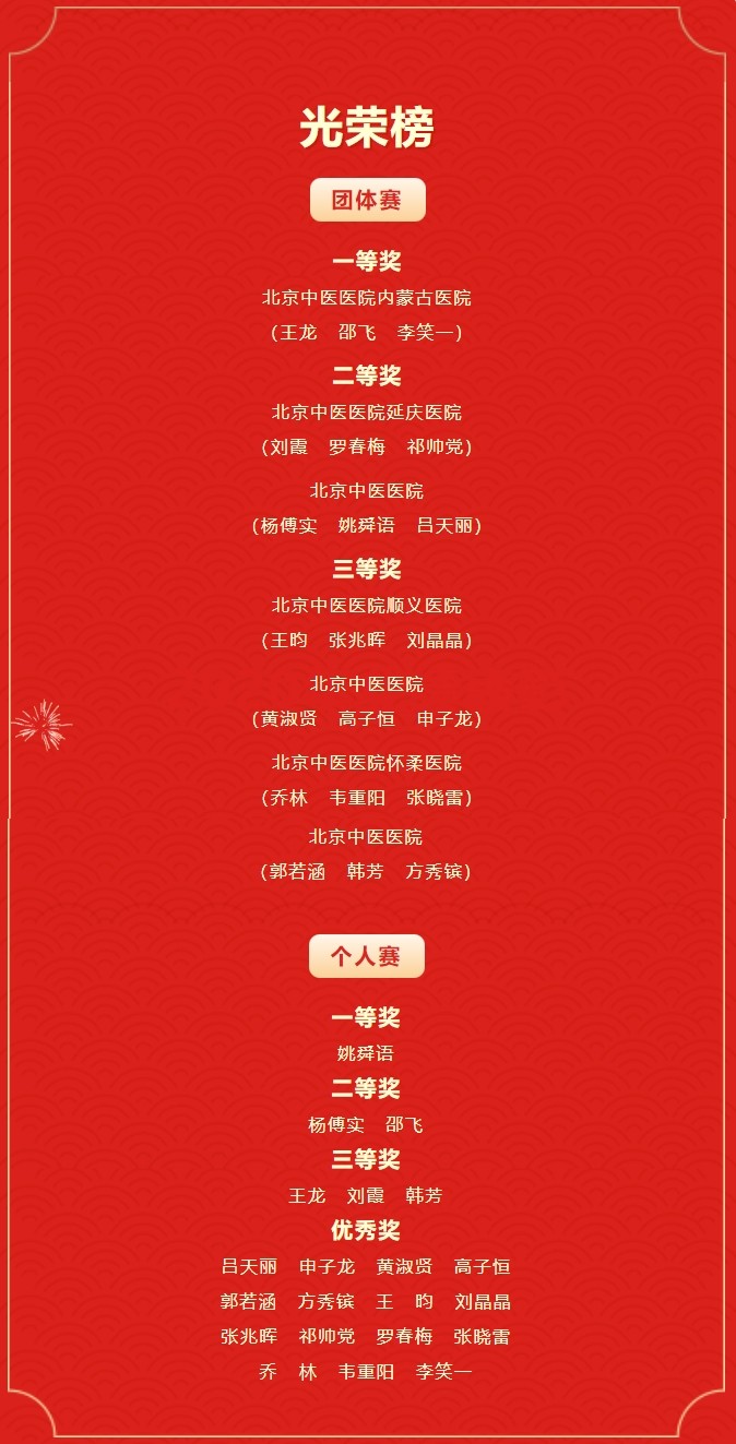前期,各医院分别举行初赛,经过层层筛选,决出21名《伤寒论》背诵高手参加此次决赛。团队赛部分,经过风险题、抢答题两轮比赛后,决出一等奖1组、二等奖2组、三等奖3组。个人赛采取《伤寒论》条文接龙进行对决。经过紧张、激烈的角逐,最终决出一等奖1名,二等奖2名,三等奖3名,优秀奖15名。