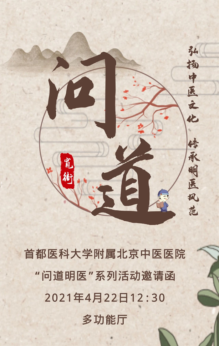 值此中国共产党建党100周年之际,为庆祝北京中医医院建院65周年,进一步坚定团员青年专业信念,为他们搭建与名老中医深度学习交流的平台,提供与名医大家近距离接触、请益问道的机会,院团委定于4月22日举办2021年度“问道明医”活动,邀请国家级名老中医王应麟教授、吕培文教授与广大青年交流分享学术经验,共忆宽街历史。