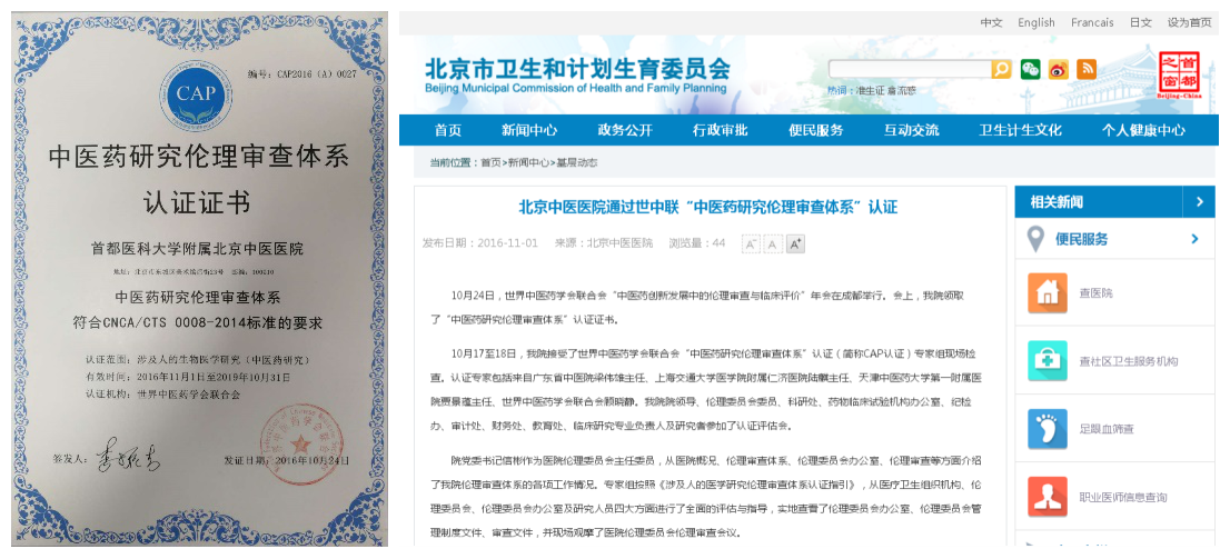 专家组对我院伦理审查体系的组织管理、伦理委员会委员的审查能力、办公室管理以及研究人员受试者保护等方面给予了充分肯定;同时也提出了按照认证要求的不符合项。我院伦理委员会按照专家现场评估意见及时递交了整改报告,顺利通过了CAP认证。2016年10月24日在成都举行的世界中医药学会联合会“中医药创新发展中的伦理审查与临床评价”年会上,我院领取了“中医药研究伦理审查体系”认证证书。