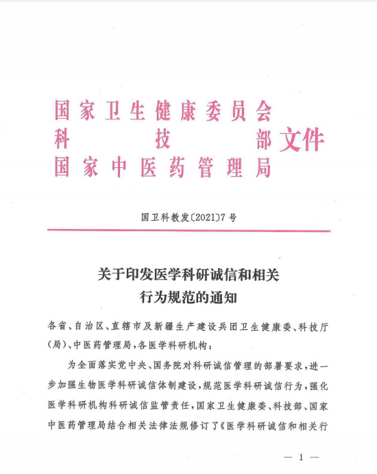关于转发国家卫生健康委、科技部、国家中医药管理局《关于印发医学科研诚信和相关行为规范的通知》的通知