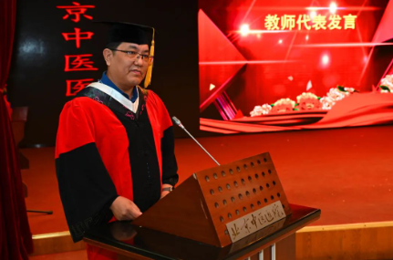 刘宝利教授代表教师发言,对学生提出了三个嘱托:做人要仁心仁义;治学要严谨求实;注意锻炼身体,笑口常开,也提出了三个希望:希望同学们不忘初心,坚守中医文化,培养独立思考能力,大胆创新,坚定自信。