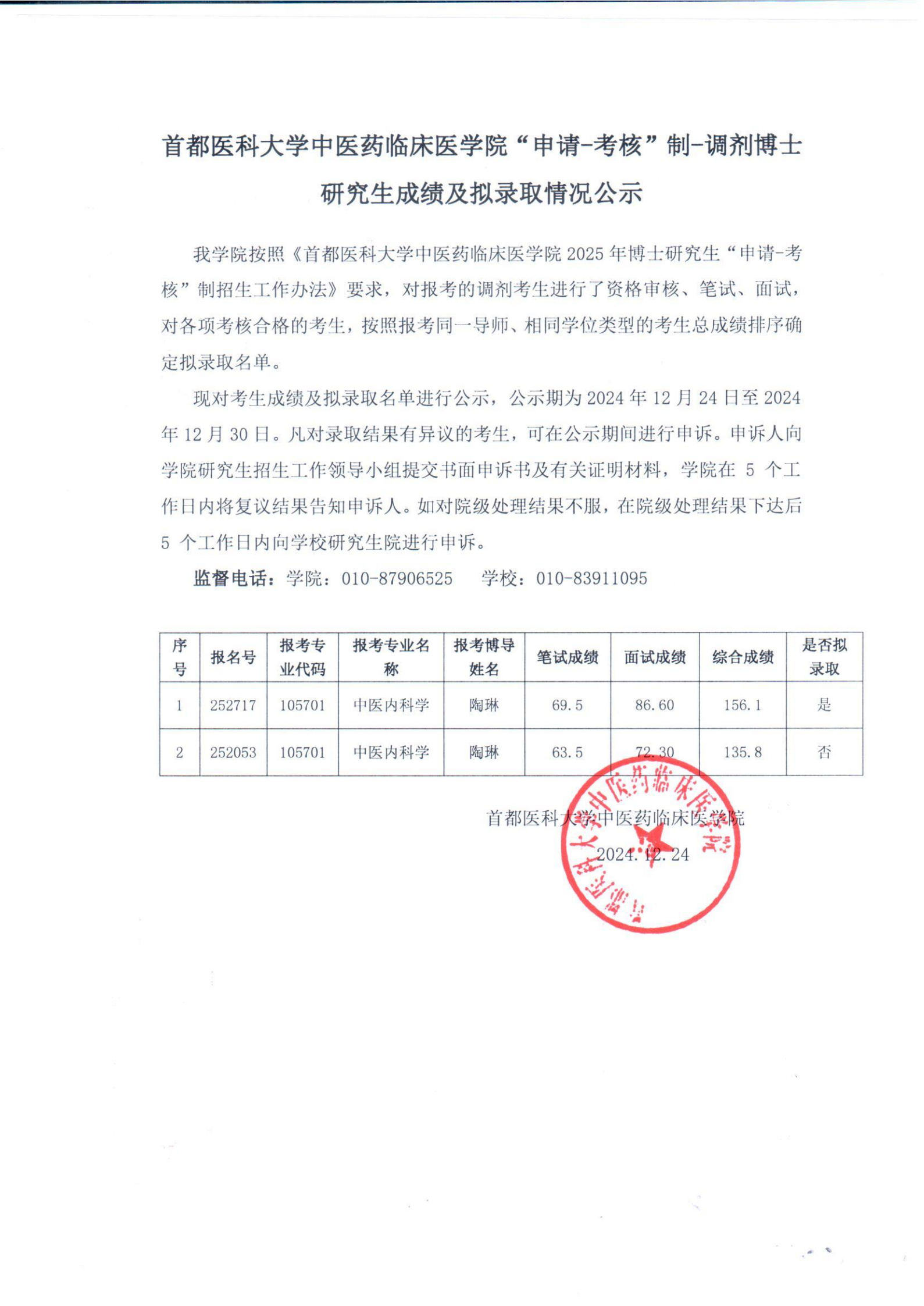 首都医科大学中医药临床医学院“申请-考核”制-调剂博士研究生成绩及拟录取情况公示